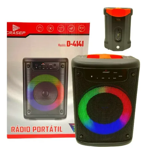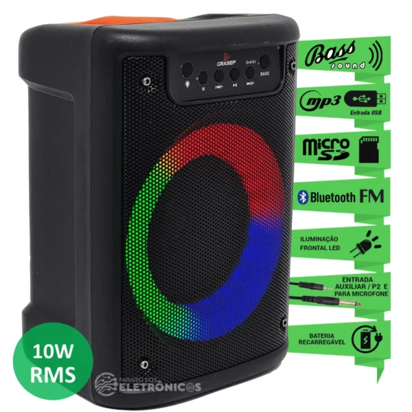 Aparelho caixa de som receptor multi-funções com frontal iluminada com LEDs Coloridos piscantes em formato RGB, com opção de liga e desliga, gerando um efeito visual. Conexão Bluetooth v5.0+EDR, entrada para Pendrive e Cartão Micro SD, Som Hi-Fi de alta qualidade, rádio FM integrado, fácil instalação e utilização, ideal para PCs, Notebooks, Smartphones, Tablets, TVs, MP3 e MP4 Players, possui controle de Graves, bateria interna com boa autonomia. Entrada para 1 microfone P10 e entrada auxiliar P2.